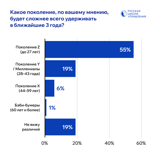 Больше половины респондентов (55%) считают, что в ближайшие три года сложнее всего будет удерживать сотрудников поколения Z — тех, кому сейчас до 27 лет.